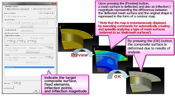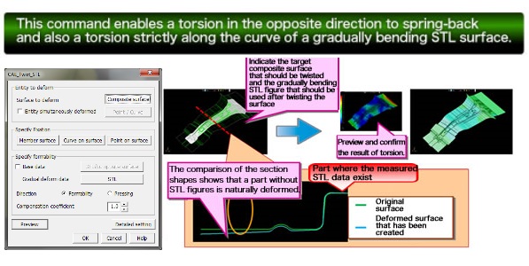 This command enables designers to twist the original surface by a torsion degree that has been figured out on the basis of forming simulation and panel measurement. This process can be performed through simple input operations.