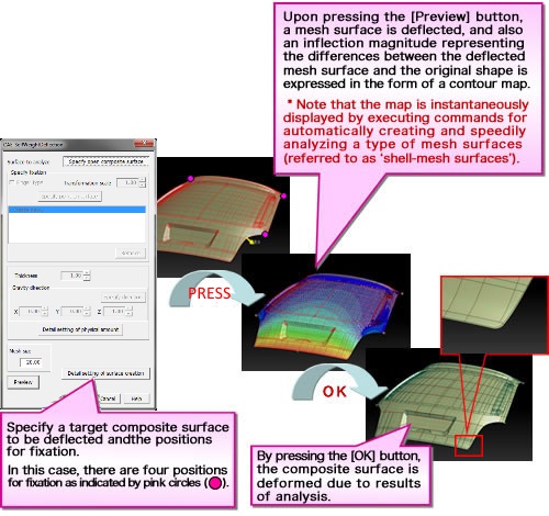 It can quickly and highly precisely perform the characteristic patterns of press die forming, confirm the accuracy of anticipated deformation amounts, confirm an empty-weight deflection, and model by considering the anticipated deformation amounts, the characteristics of materials and STL figures.