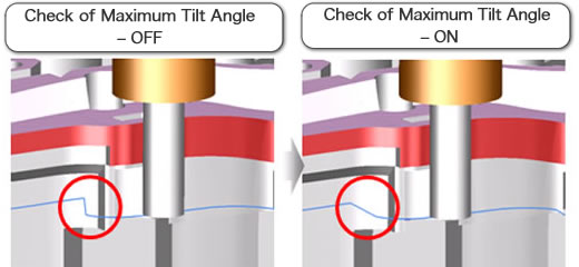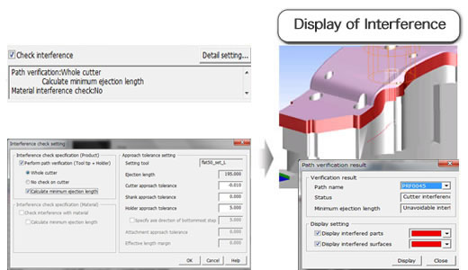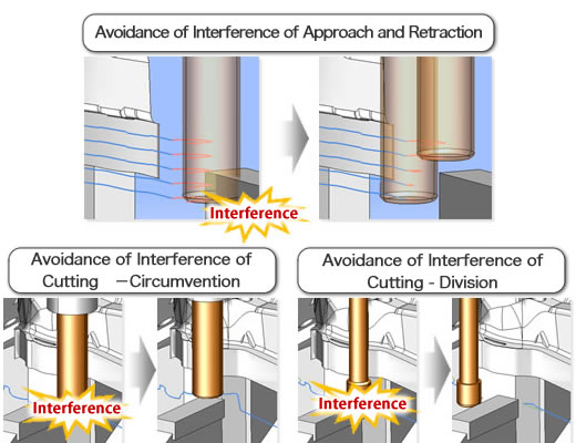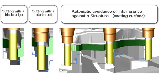 Interference can checked between a tool (blade edge or tool holder) and a model surface or a seat surface when paths are created. Safe paths without tool interference can be automatically created; it is a man-saving process.