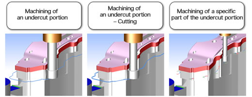 The machining methods create a path that enables the use of an undercut machining tool without causing interference against the trimming blade. The path continues to be as wide as the width of trimming blade. The path also supports re-iteration of a thrust machining of undercut portions.