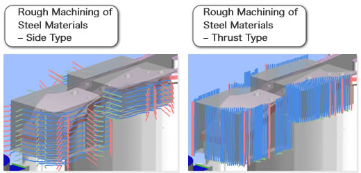 Paths for roughly machining steel materials can be created by executing the command for machining contours or Thrust machining.