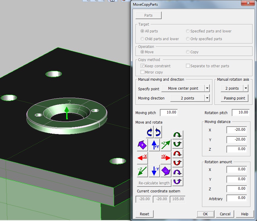 Parts that have been created and assigned can be moved and copied in the direction of axis or any specified direction at a specified pitch. Also, they can be revolved and copied. Placement and Copy of Parts
