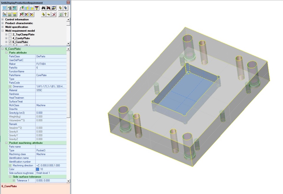Part attributes, machining attributes, and tolerance attributes can be set for the parts that comprise a mold.