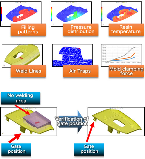 Problems of resin flow caused during an injection molding can be forecasted. It is possible to analyze the filling patterns, pressure distribution, resin temperature, weld lines, air traps, and mold clamping force.