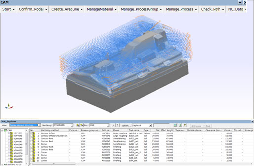 CAM Explorer enables users to manage multiple phases for machining dies/molds through the use of a tree structure. It enables efficient management of phases in accordance with the individual purposes.