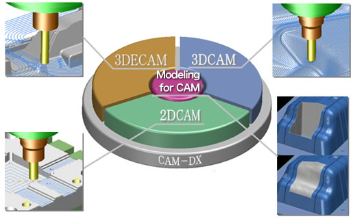 Thus, CAM-DX is a combination of high-speed and high-quality machining methods and conventional proven methods. It can respond to a wide variety of users' needs.