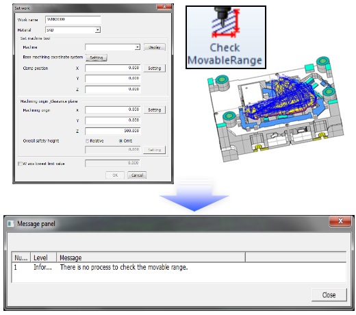 The scope of machining and the usability of angle-adjusting accessories (Attachments) can be checked, provided that a position of material and the information of machine have been input.