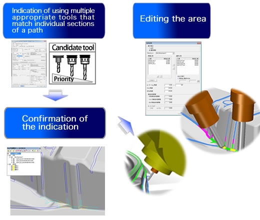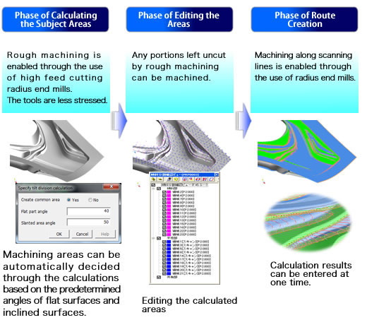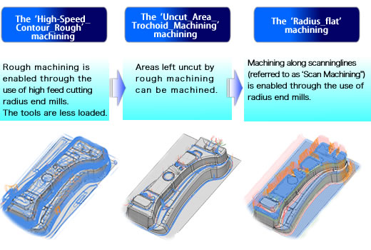 High-speed rough machining is enabled through the use of high feed cutting radius end mills. Furthermore, any portions of corners or gentle slopes that have been left uncut by the rough machining can be efficiently machined.