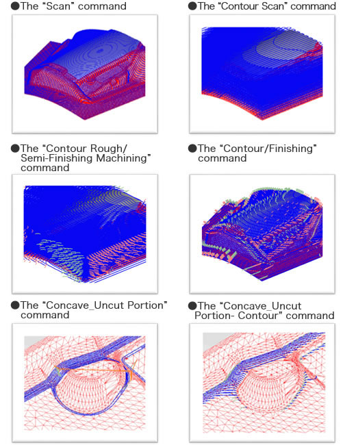 It supports a reverse-engineering type of machining. It is capable of drawing data from STL figures such as measurement results and from models consisting of surface data and solid data, and then creating paths for rough machining and finish machining, checking interferences, and outputting NC data.