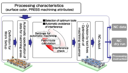 This system automatically processes a subject area on the basis of the characteristics data of press machining. It also automatically creates paths for the primary machining of a Structure, ferrous die of receiving a press die 'insert'.