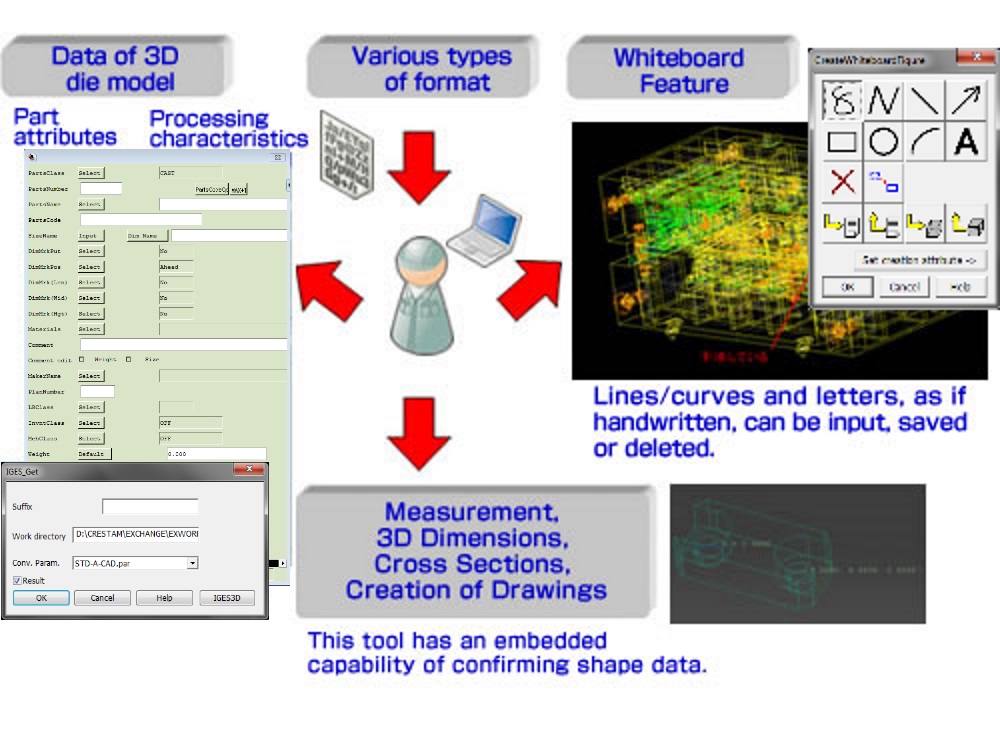 It is capable of meeting the requirements of data use at actual manufacturing sites as well as dimensional measurement, creation of 2D drawings, and interference checks.