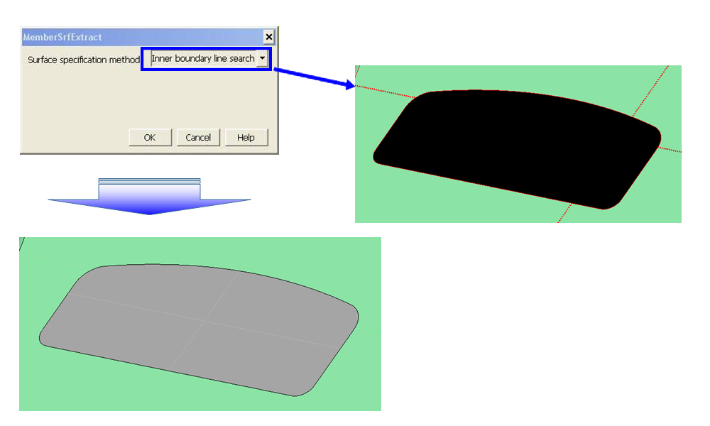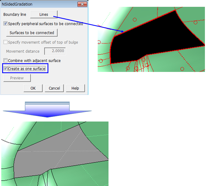 Hit the target surface after specifying 'Inner boundary line search'. And, the holes consisting of inner line boundary lines/curves in the surface will be detected. Surfaces (referred to as 'interpolation surfaces') will be created simultaneously based on the basic surface. Thus, the holes will be filled in at one time.