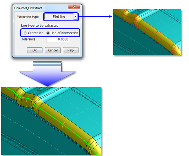 This simple process enables an easy creation of a center line as well as a ridge line of a pin angle (referred to as 'Line of intersection' in the palette window).