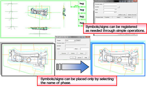 This command enables an easy one-time placement of symbols/signs in each drawing of individual phases through simple operations. Users can register their symbols/signs that they use.
