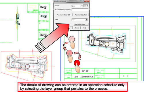 This command helps an easy examination of layout designs due to the capabilities below: displaying the data of shapes and specifications for a specific press machine on a palette window; and setting the machine on the same screen.