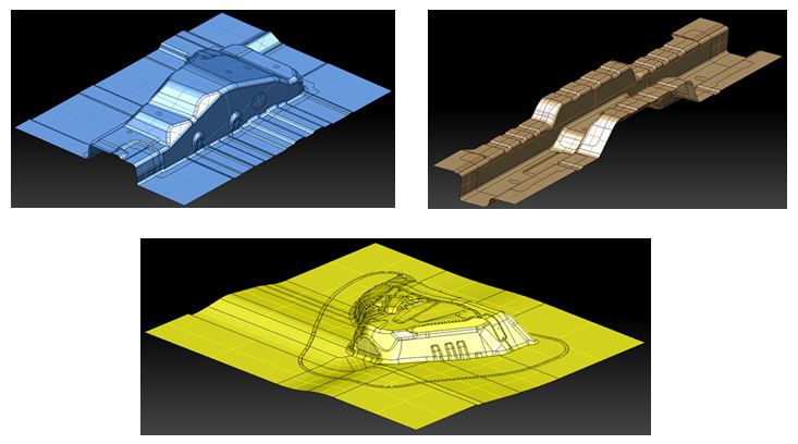 "In case of modify spring back at draw panel, scanning the model. The STL data (scanned data) is used to compare with original surface (CAD data). Later, use STL data and CAD data to create trim line and new surface in CADmeister. After that, creating jig and support parts. Next, do laser cutting refers to trim line. The trimmed part has high quality result. Finally do reverse engineering operation again by bending part. The result’s position is very much better.